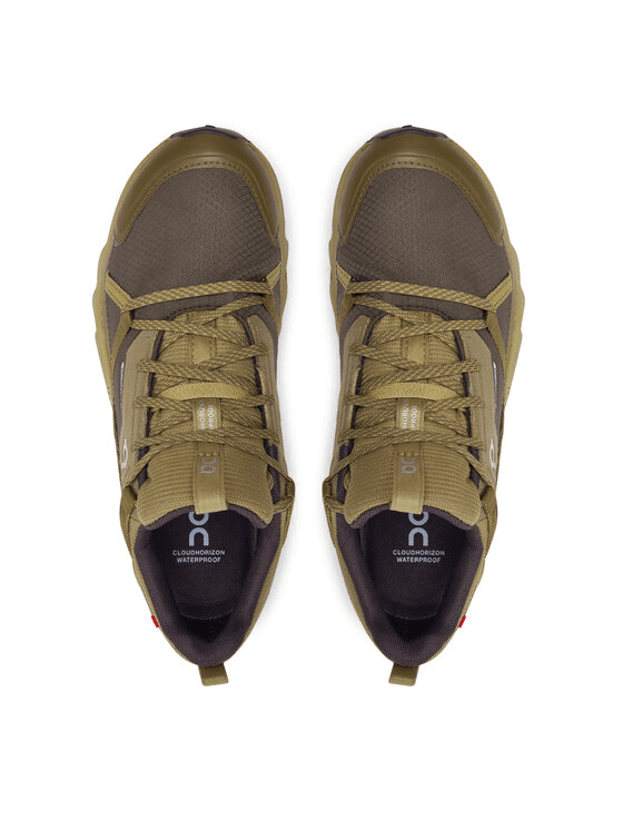 Der On Cloudhorizon Waterproof in Safari/Olive ist eine stilvolle und funktionelle Wahl für Damen-Outdoor-Schuhe. Dank seiner wasserdichten Membran bietet dieser Schuh optimalen Schutz vor Witterungseinflüssen.