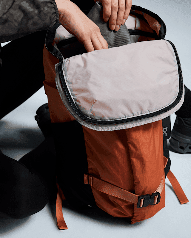 Ideal zum Mitnehmen, mit Tragegriffen aus Schweizer Seil, die einen Hauch von alpinem Stil verleihen. Eine verstaubare Regenhülle hält Ihre Ausrüstung trocken, und Schlauchdurchführungen ermöglichen das Mitführen einer Trinkblase. So sind Sie jederzeit bereit für jedes Abenteuer.